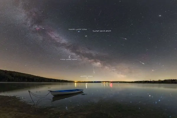 بنابراین، هنگامی که زمین از این مدار عبور میکند، منبع شهابی حاوی بقایای دنبالهدار تاچر، در صورت فلکی شلیاق پدیدار میشود. این تصویر ترکیبی، شامل بیش از ۳۳ شهاب است که مربوط به بارش شهابی شلیاقی ماه گذشته است و چند شهاب درخشان را که بر فراز ساحل دریاچه Seč واقع در جمهوری چک به سرعت حرکت میکنند، نشان میدهد. علاوه بر این، ستارههای درخشان «کرکس نشسته»، «نَسر واقع» یا «آلفا شلیاق» (Vega) و «کرکس پرنده»، «نَسر طایر» یا «آلفا عقاب» (Altair)، سیاره «مشتری» (Jupiter) و کمربند مرکزی «کهکشان راه شیری» (Milky Way Galaxy) نیز در آن قابل مشاهده هستند.