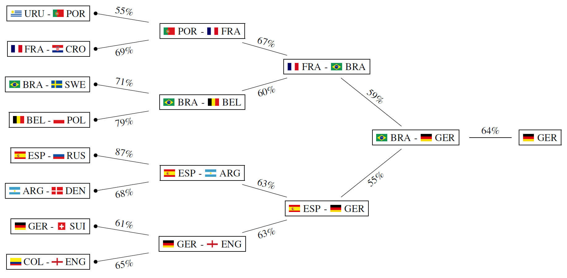 در جدول فوق میبینیم که هیچ تیمی غالب نیست؛ ولی چند تیم هستند که شانس خوبی دارند. علاوه بر احتمال کلی قهرمانی جام جهانی، در جدول زیر محاسبات جالب دیگری برای مراحل منفرد درون تورنمنت ارائه شده است. برای مثال میبینیم که تیمهای اسپانیا و آلمان تقریباً شانس برابری برای رسیدن به مرحله یک هشتم نهایی دارند. با اینکه اسپانیا دستکم به احتمال 73.1 درصد به یکچهارم نهایی میرسد؛ اما آلمان تنها 58.0 درصد این احتمال را دارد. بدیهی است که آلمان برخلاف اسپانیا به احتمال بیشتر در مرحله یک هشتم با رقیب قدرتمندتری مواجه خواهد شد. در حالتی که این دو تیم به مرحله یک هشتم برسند، آلمان احتمالاً با یکی از تیمهای برزیل، سوئیس، صربستان یا کاستاریکا مواجه خواهد شد؛ در حالی که اسپانیا با یکی از تیمهای اروگوئه، روسیه، عربستان سعودی یا مصر مواجه میشود. در مراحل بعدی شانس قهرمانی آلمان بهتدریج با اسپانیا برابر میشود.